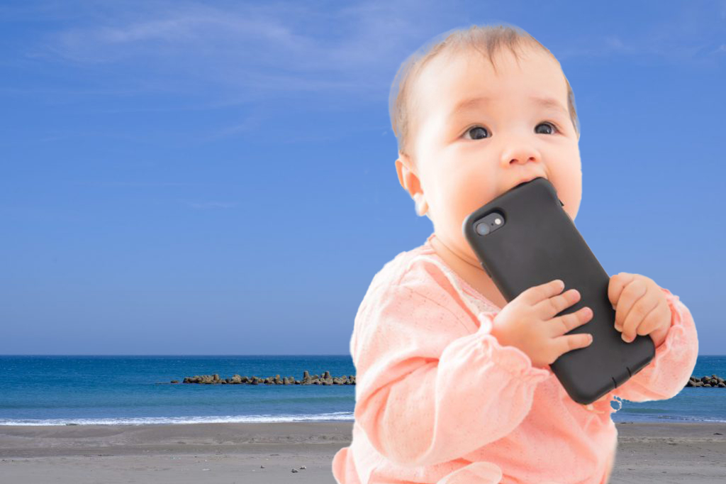 概要:赤ちゃんの画像を切り抜き(オブジェクト選択、スマートオブジェクト変換作業)、海に大きな赤ちゃんを登場させた。資料画像1