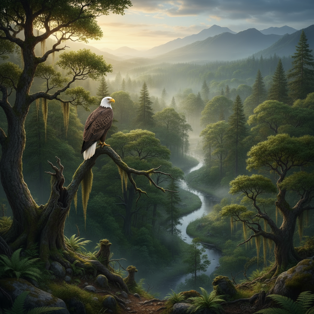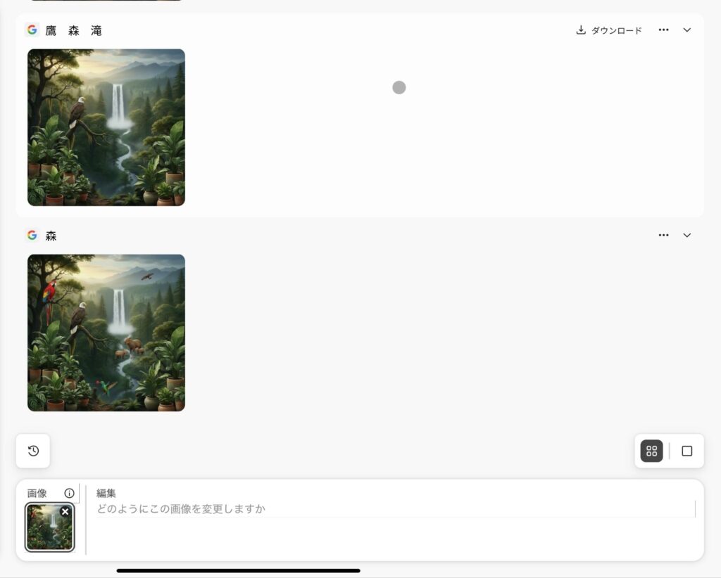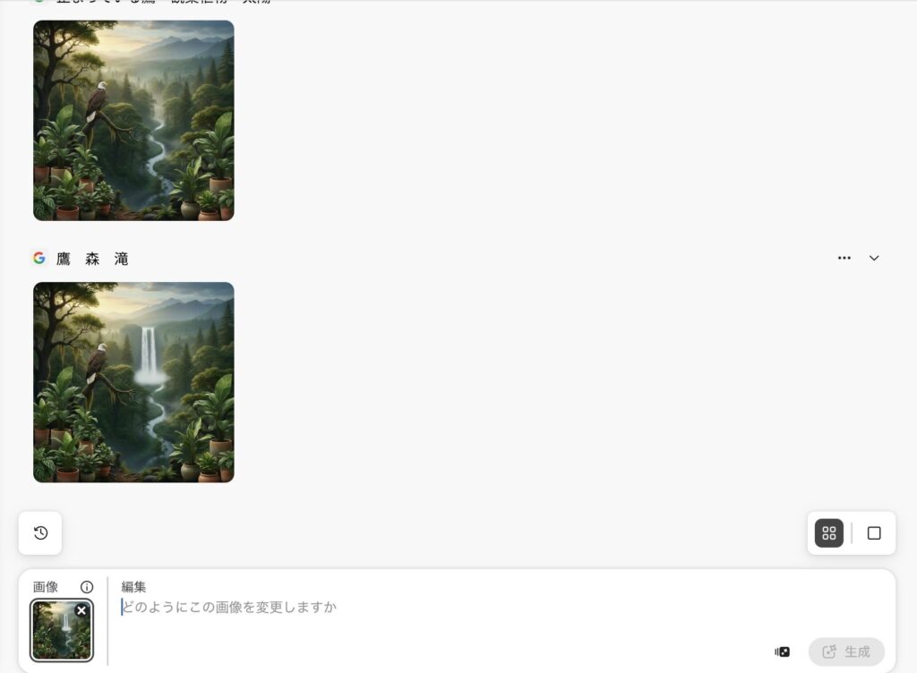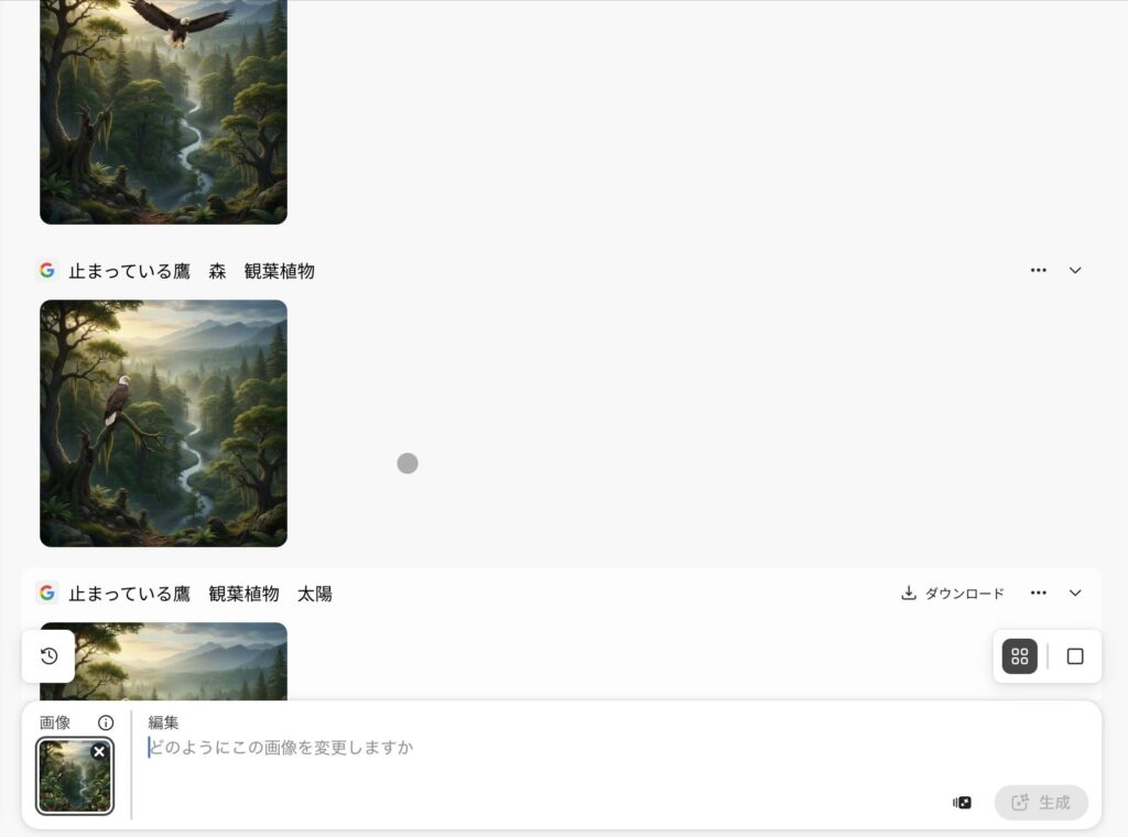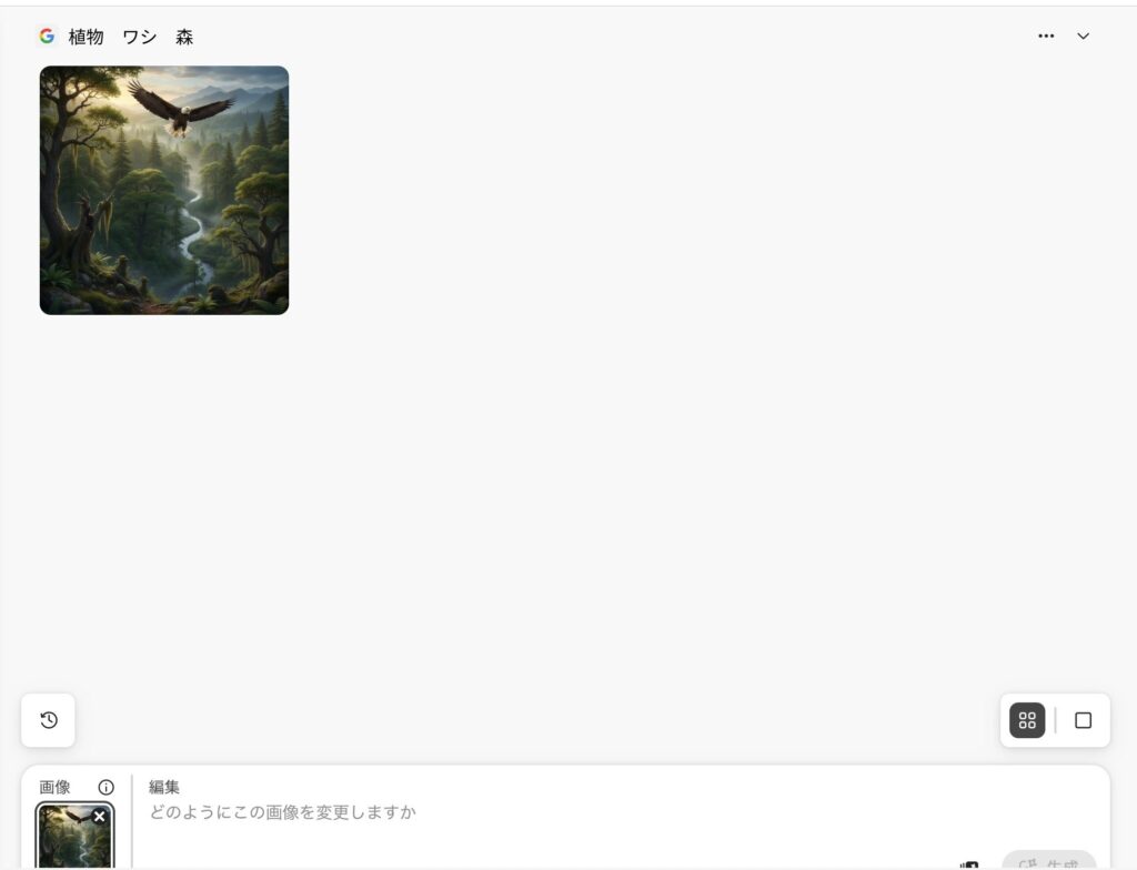 1 プロンプトに「植物、ワシ、森」と入力。かなり抽象的だったが川も流れる雰囲気の良いものが最初から出てきた。