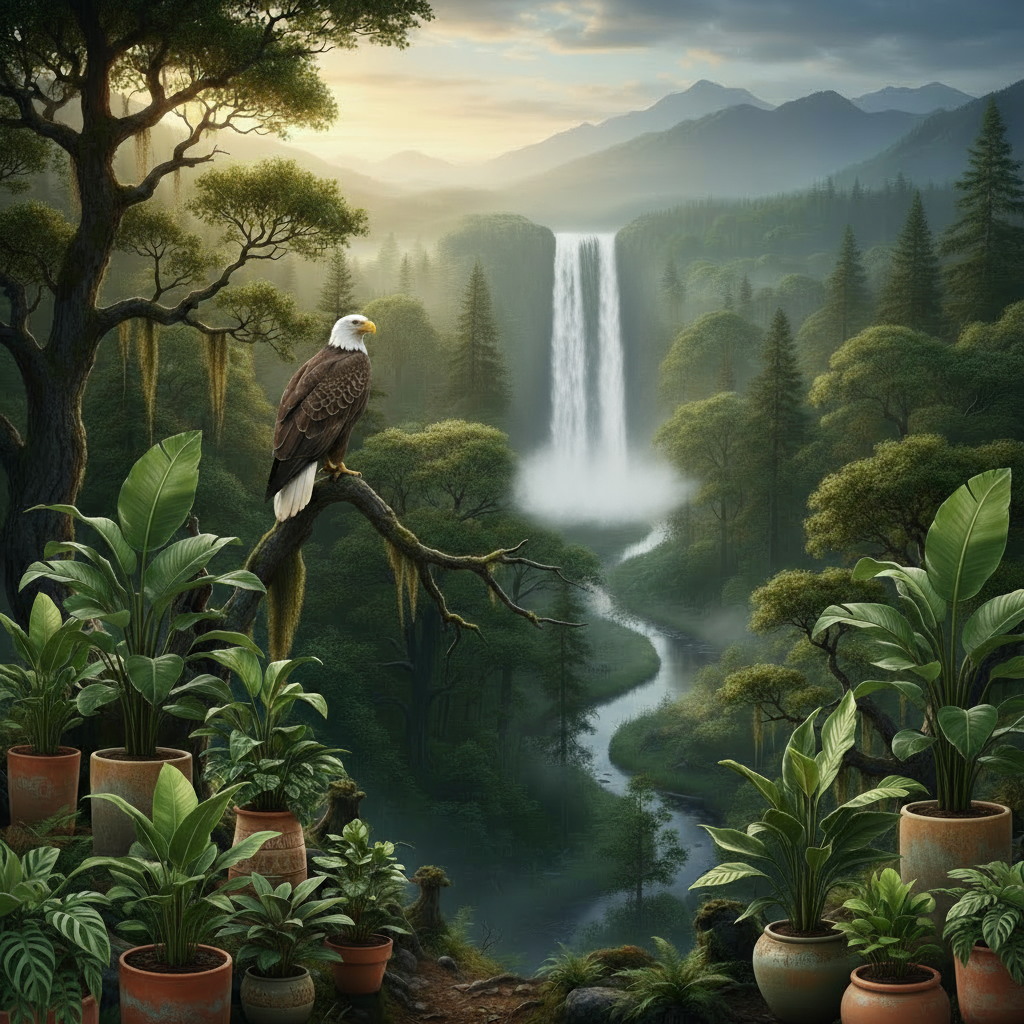 4 次にプロンプトに「鷹、森、滝」と入力。一番入力が抽象的であるが実際どう出るか試みた。観葉植物は引き続き出てきた。滝は遠近感がなく、ダイレクトに画像の貼り付けをした違和感のあるものになった。