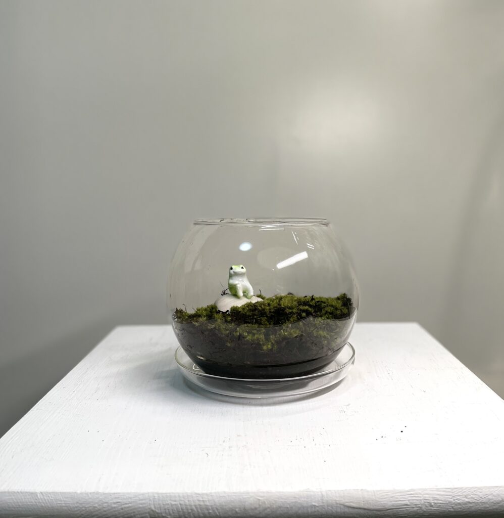 直径15センチほどのガラスボールを準備し、植物はヤマゴケとシノブを準備した。