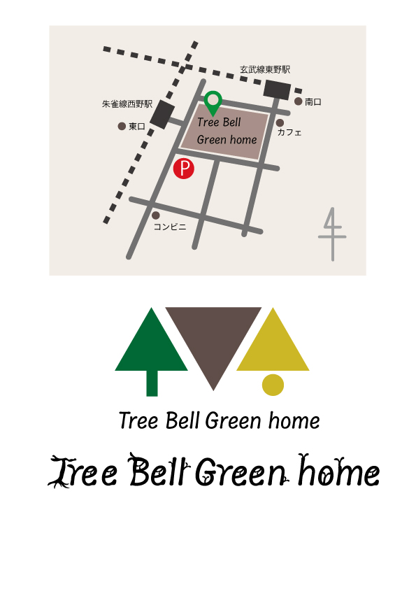 架空のガーデニング店「Tree Bell Green home」があると考え、アクセスマップとロゴマークの制作に至った。