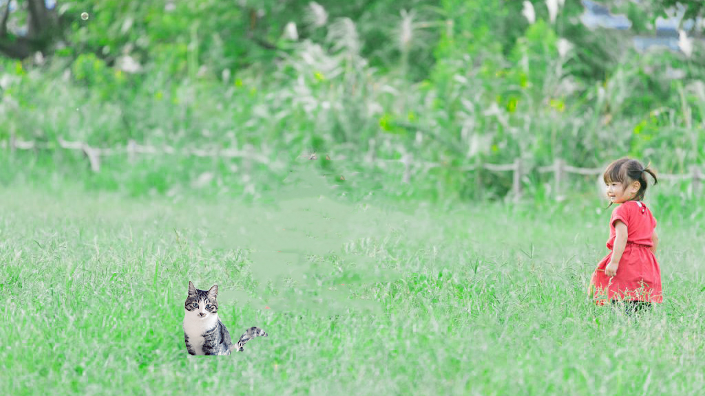 座っている猫を切り抜き、猫のしっぽを作る。そして、草原の画像に載せる。猫の色調補正を行う。左右上が元画像。下が編集画像